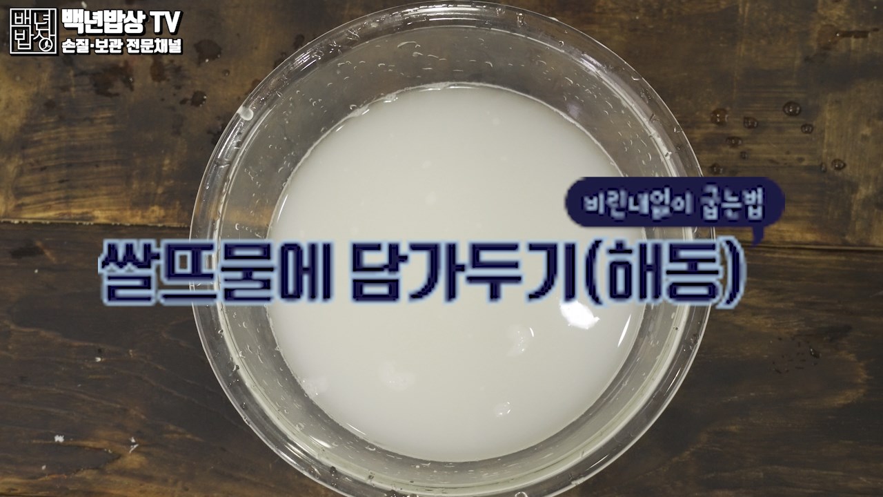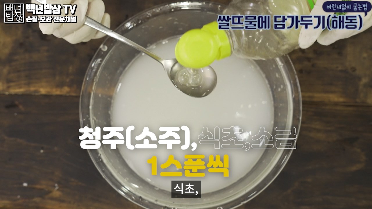 쌀뜨물에 청주(소주), 식초, 소금을 한 스푼씩 넣은 후, 고등어를 담가주세요.