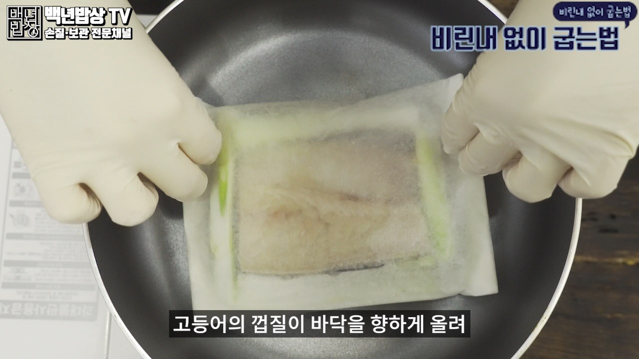 프라이팬을 달군 뒤, 고등어의 껍질이 바닥을 향하게 올려 뚜껑을 닫고 중약불에서 구워주세요. (살부터 구우면 수분과 지방질이 흘러나와 풍미가 덜하게 됩니다) 어느 정도 구워지면 종이호일째로 뒤집어 반대편도 구워주세요.
