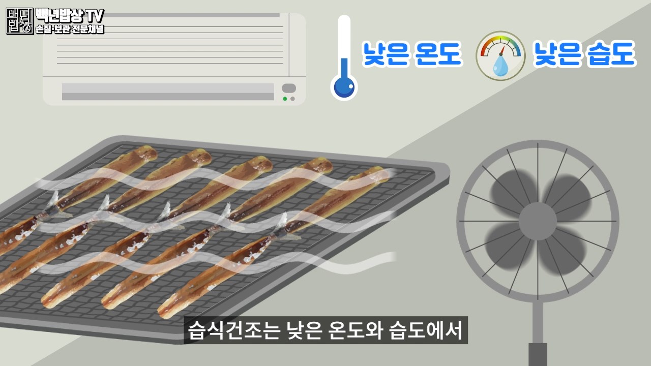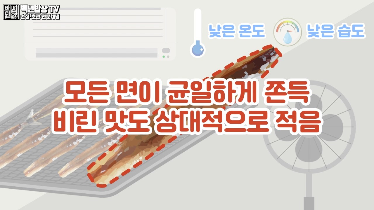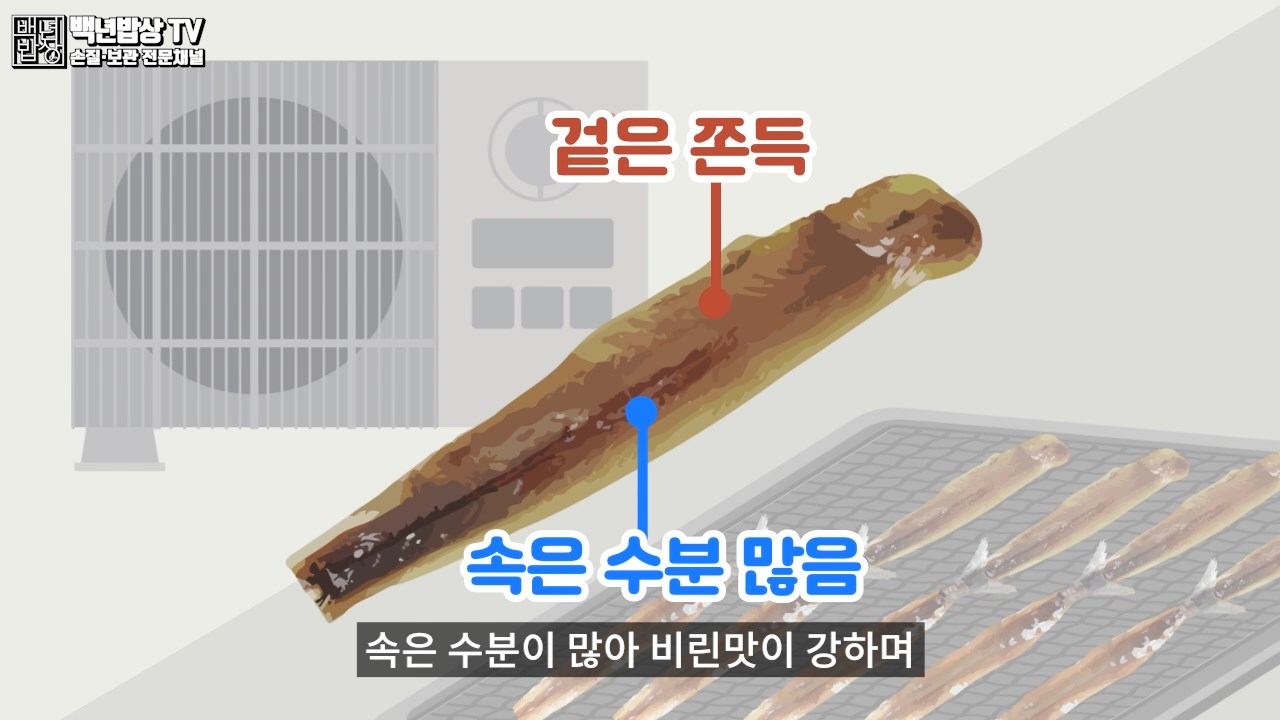 실내건조로는 열풍 건조와 습식건조가 있습니다. 열풍 건조는 빠르게 말려 겉은 쫀득하지만 속은 수분이 많아 비린 맛이 강하며, 쉽게 상할 수 있어요.