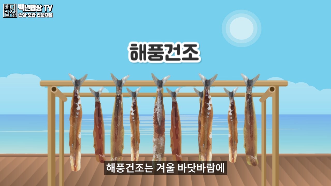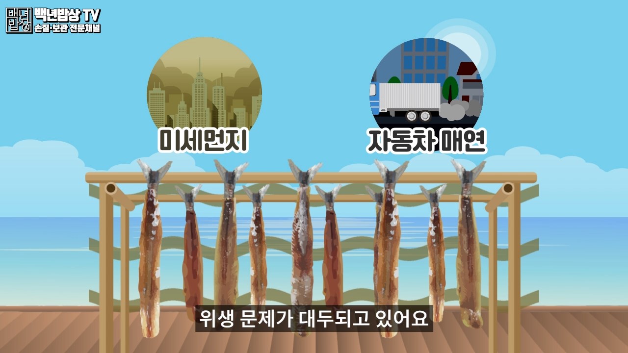 해풍 건조는 겨울 바닷바람에 냉동과 해동을 반복하여 건조하는 전통방식입니다. 시간이 많이 들어 생산성이 떨어지며, 미세먼지나 자동차 매연 등 위생 문제가 대두되고 있어요.