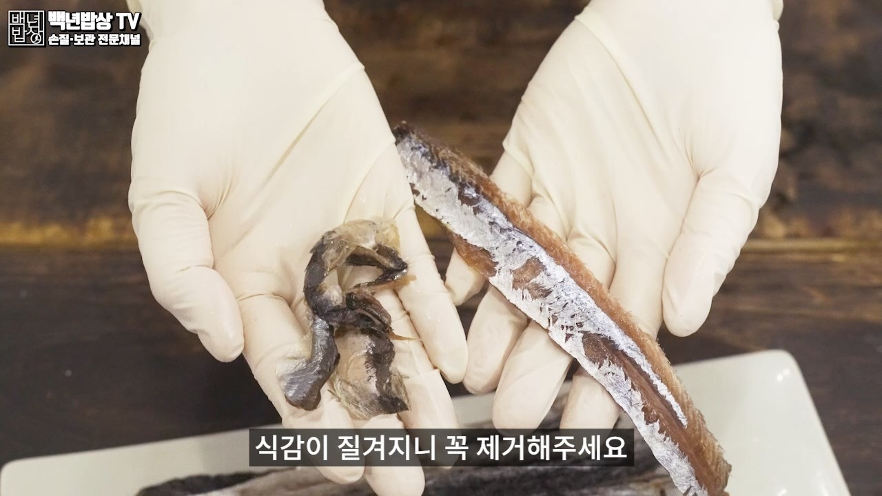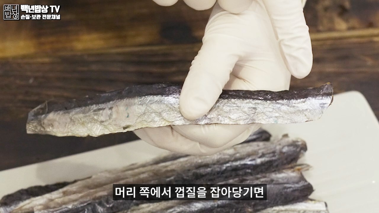 과메기 맛있게 먹는법으로, 껍질은 벗겨내지 않으면 비린내가 나고 식감이 질겨지니 꼭 제거해주세요. 머리 쪽에서 껍질을 잡아당기면 쉽게 제거할 수 있어요. 번거로우시다면 완전 손질된 과메기를 구매하시는 것을 추천해드립니다.
