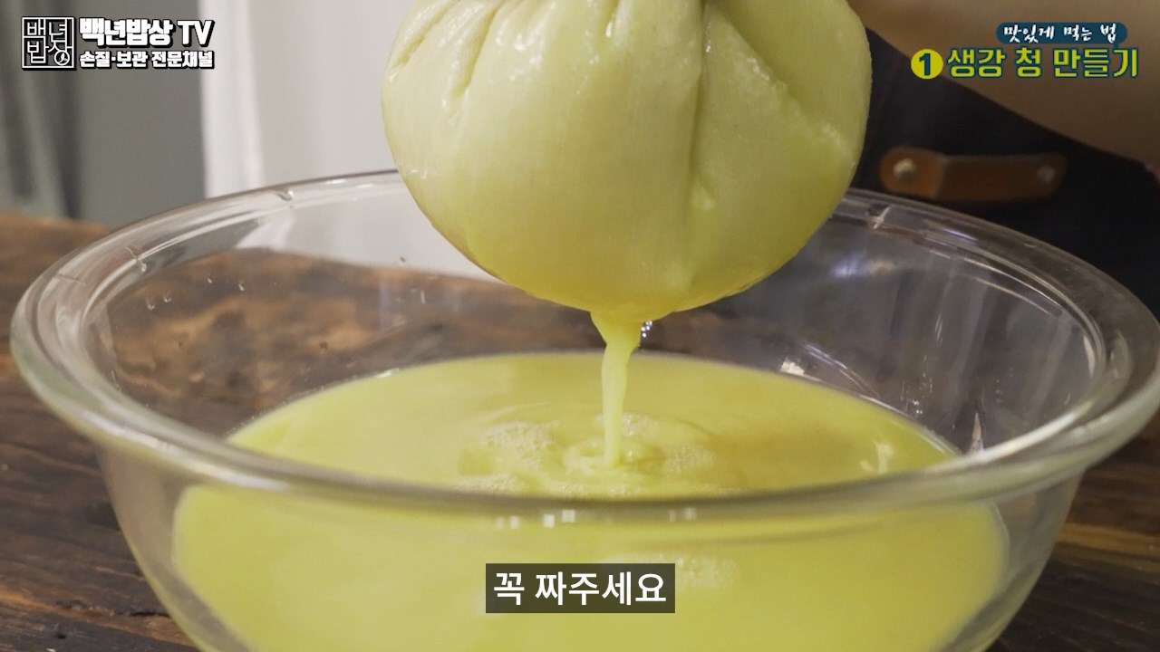 갈아놓은 생강을 면 보자기에 담고 꼭 짜주세요. (맨손으로 하면 손이 아릴 수도 있으니 장갑을 끼고 하시는 것을 추천해 드려요) 짜 놓은 생강즙은 한 시간 정도 두어 전분과 분리해주세요. (전분이 들어가면 서로 엉켜붙어 젤리나 묵처럼 변하고, 맛도 텁텁해집니다)