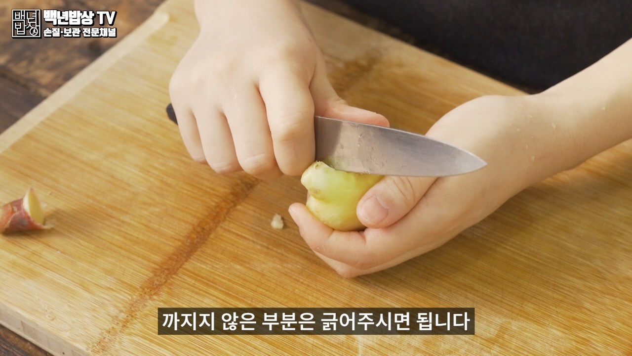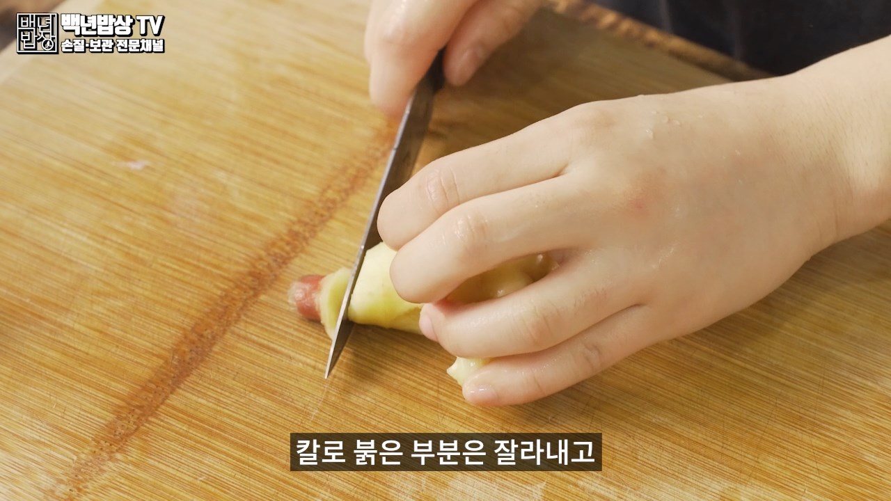 칼로 붉은 부분은 잘라내고, 까지지 않은 부분은 긁어주시면 됩니다. (붉은 부분은 줄기의 껍질이 남은 것으로 식감이 좋지않아요)