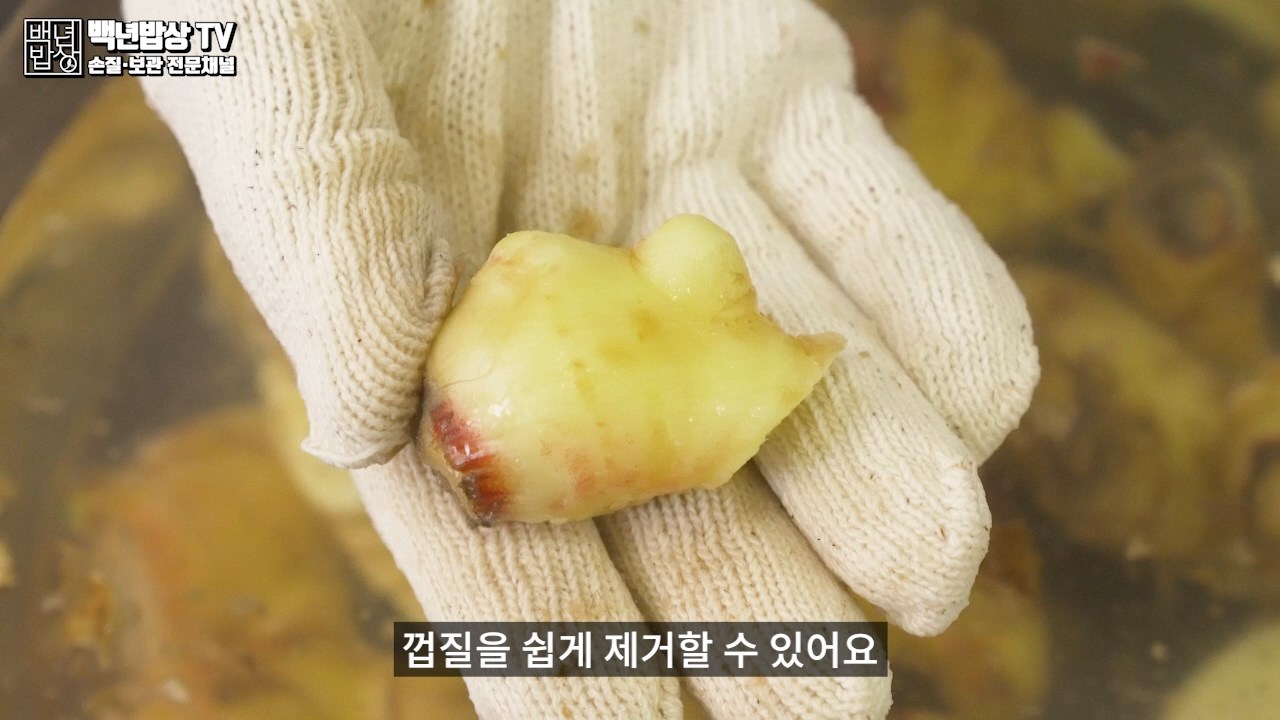 생강 껍질 쉽게 까는 법 TIP. 생강 쉽게까는 법으로, 먼저 덩어리 결대로 따고 헹군 후, 1~2시간 물에 담가서 충분히 불려주세요. 면장갑을 끼고 문지르면 껍질을 쉽게 제거할 수 있어요.