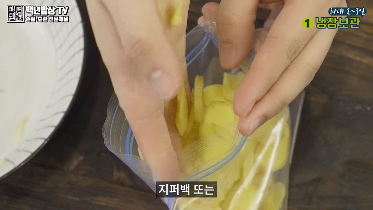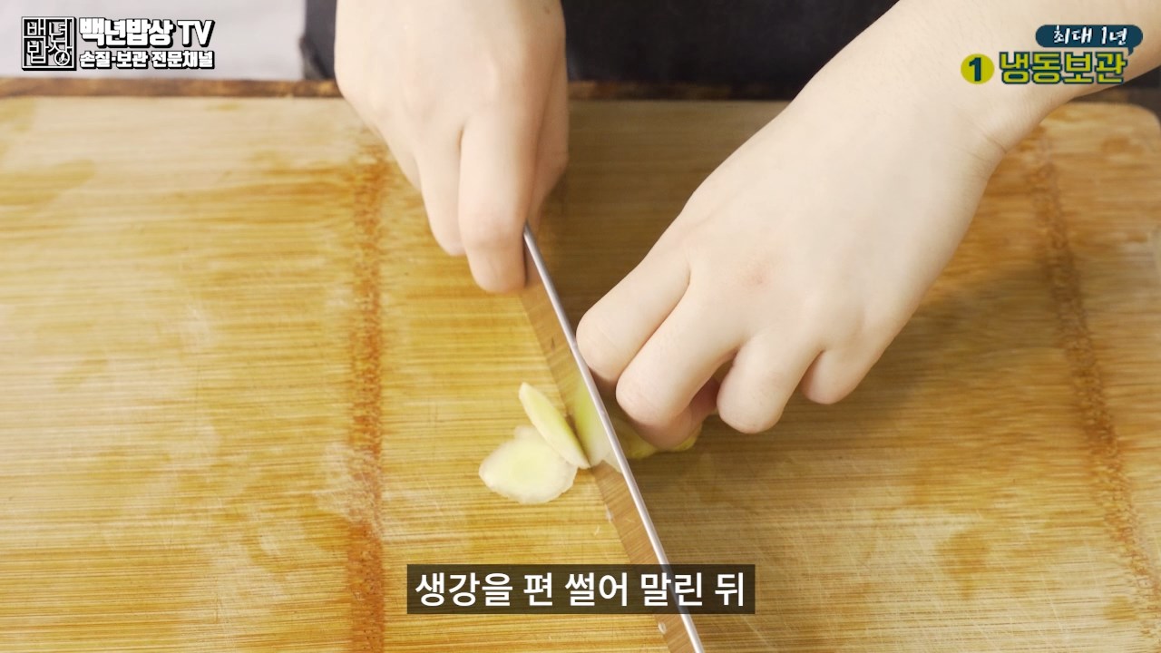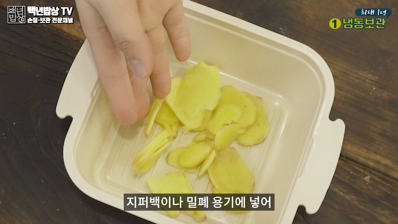 생강을 편 썰어 말린 뒤, 지퍼백이나 밀폐 용기에 넣어 냉동시켜주세요.