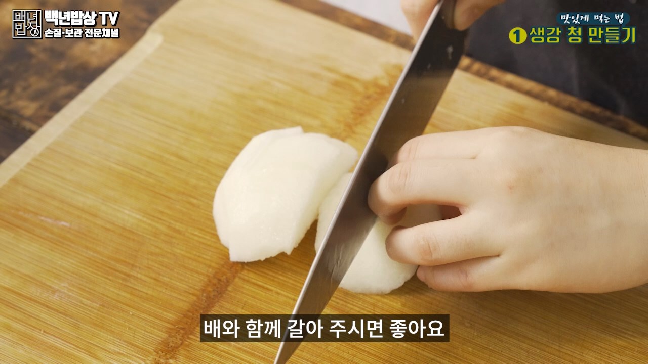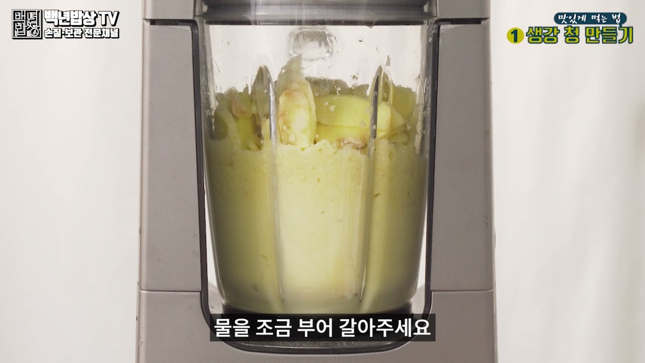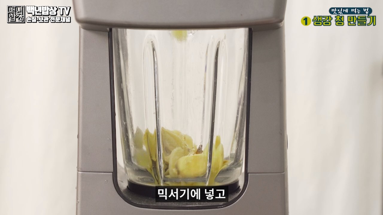 1. 생강청 만드는 법 : 생강을 편 썰어 믹서기에 넣고 물을 조금 부어 갈아주세요. 생강의 매운맛이 부담스러운 분들은 배와 함께 갈아주시면 좋아요.