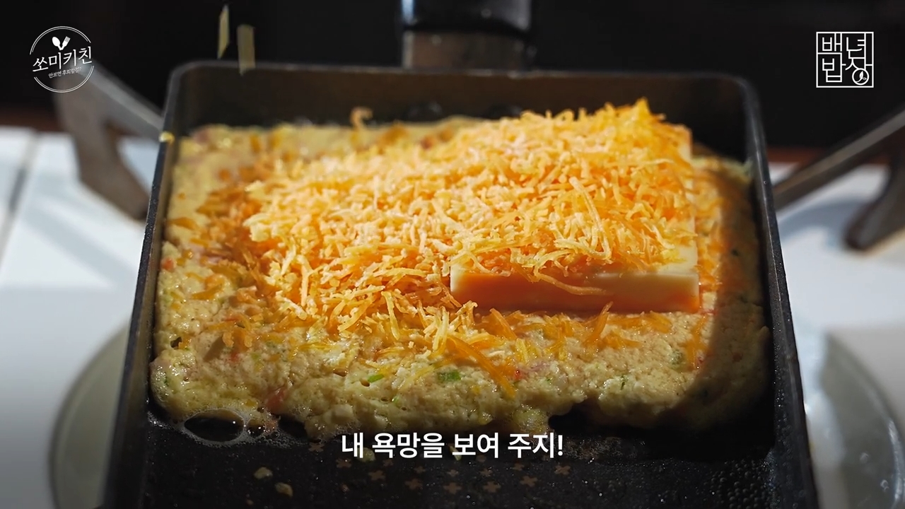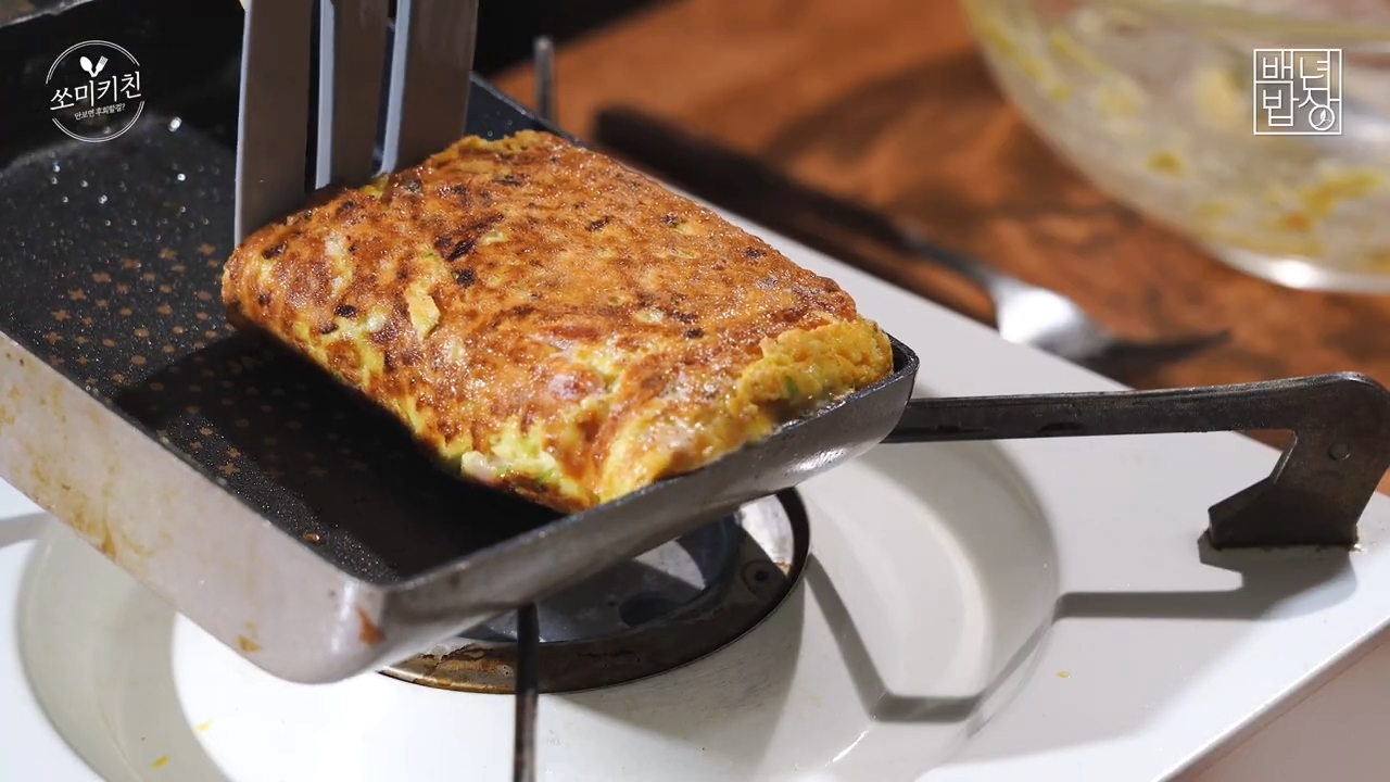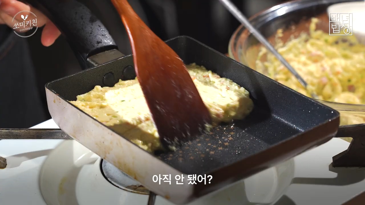 5. 사각팬에 기름을 둘러 달구어 준 다음 두부 반죽을 사각팬에 1/2만 채워지도록 평평하게 펼쳐 준다.