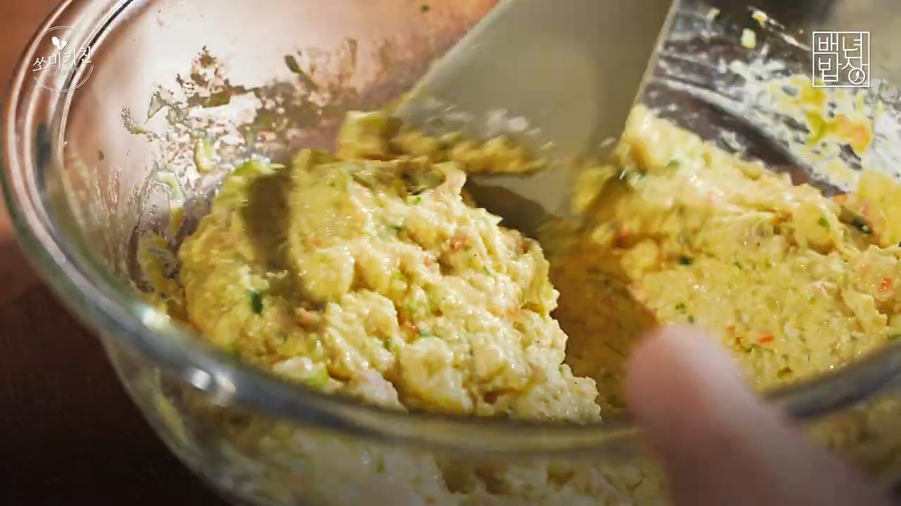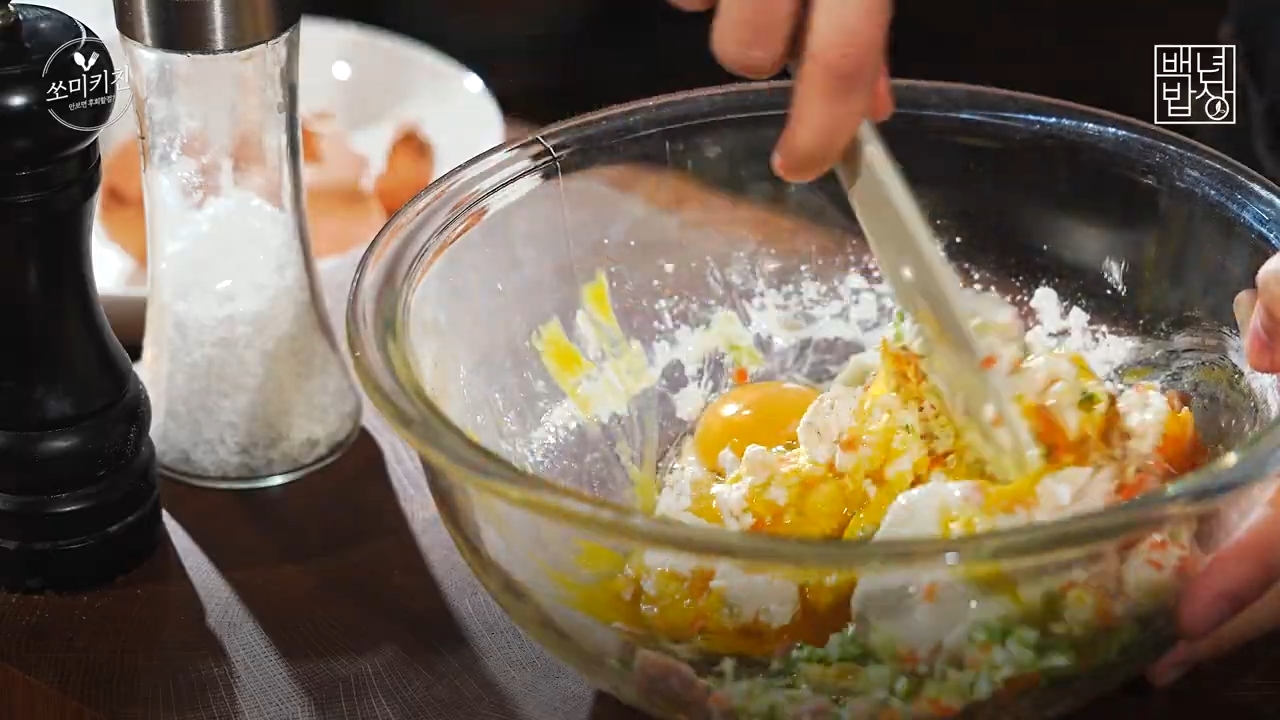 4. 두부, 계란, 다진 야채, 전분, 소금, 후추를 넣어 골고루 섞어 준다.