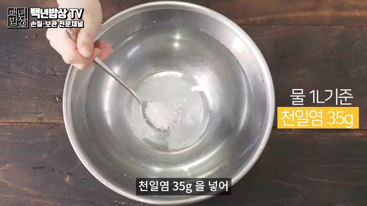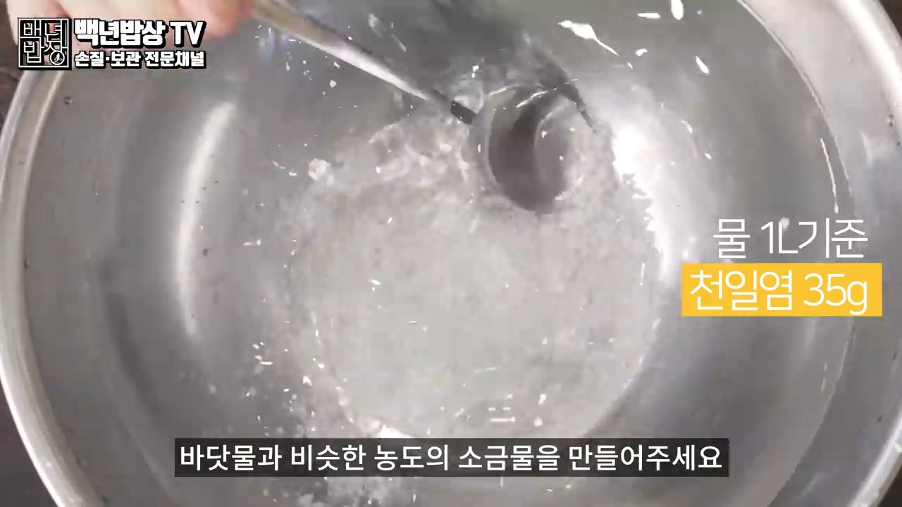 먼저 볼에 물 1L 기준 천일염 35g을 넣어 바닷물과 비슷한 농도의 소금물을 만들어주세요