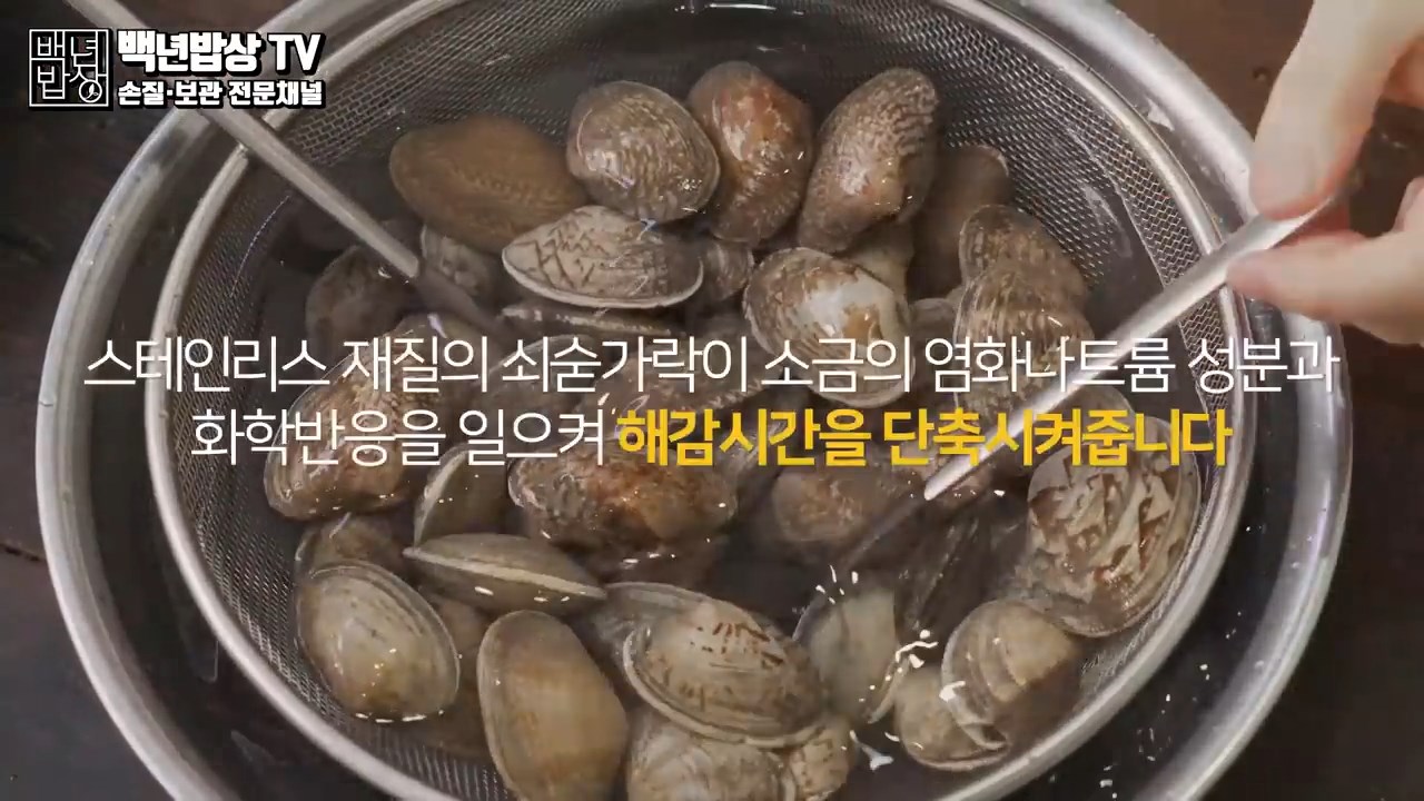 스테인리스 재질의 쇠숟가락이 소금의 염화나트륨 성분과 화학반응을 일으켜 해감시간을 단축시켜 줍니다.
