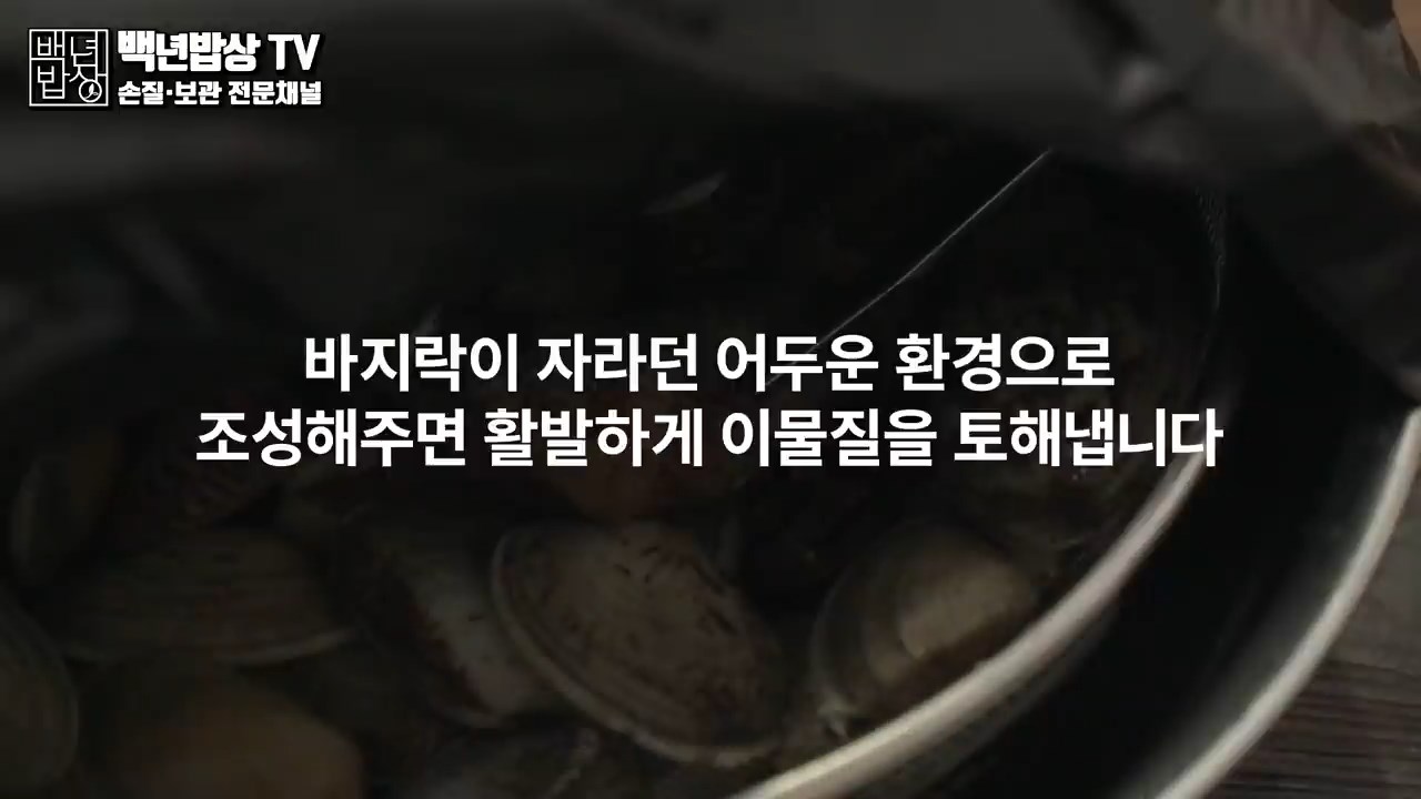 바지락이 자라던 어두운 환경으로 조성해주면 활발하게 이물질을 토해냅니다.