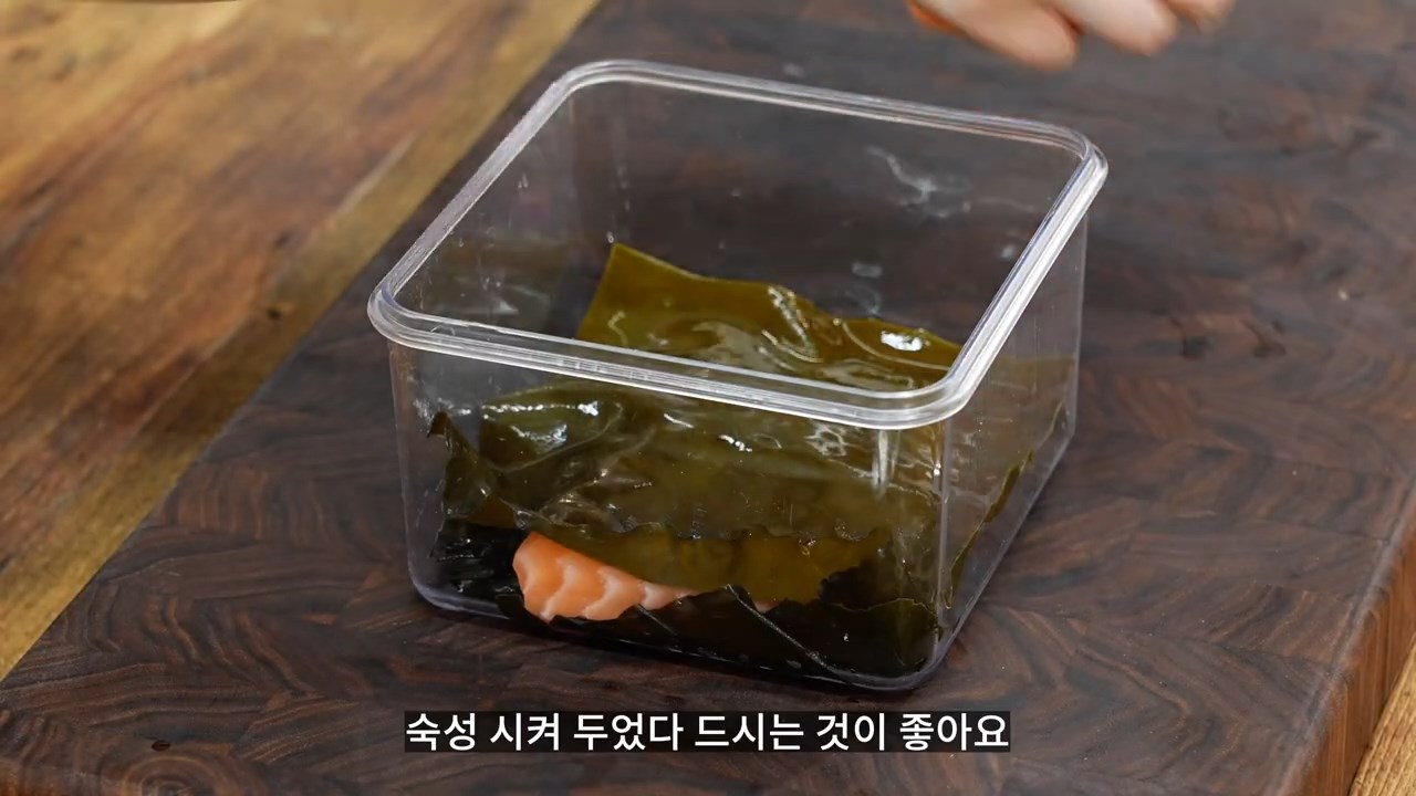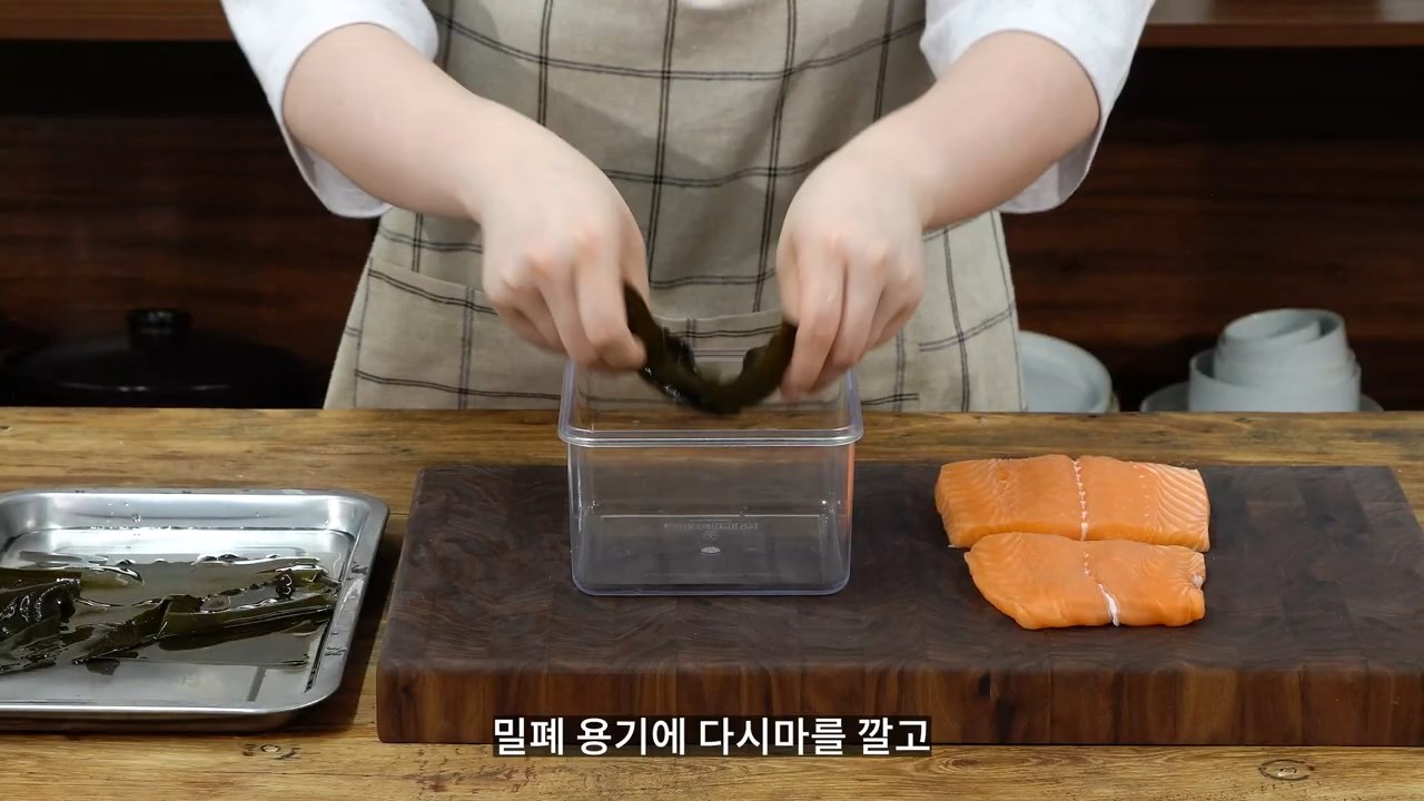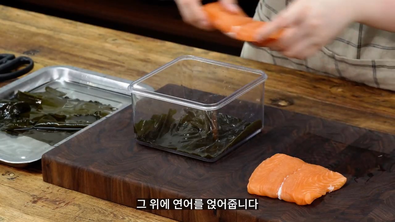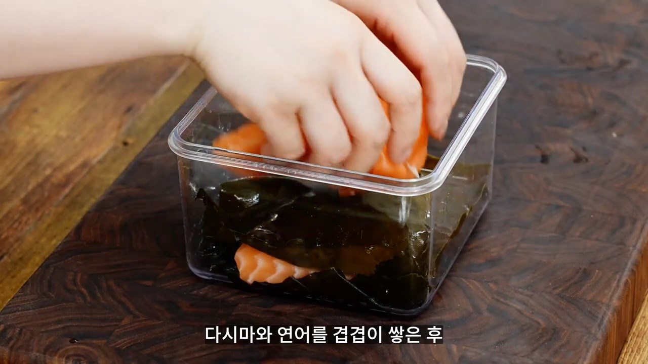 밀폐 용기에 다시마를 깔고 그 위에 연어를 얹어줍니다.