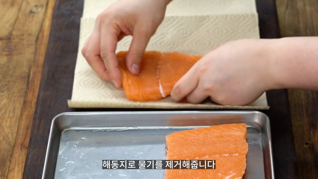 연어를 건져내어 흐르는 물에 세척한 후 물기를 제거해 주시면 됩니다.