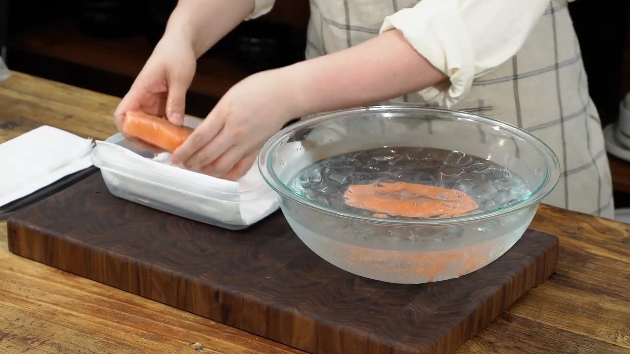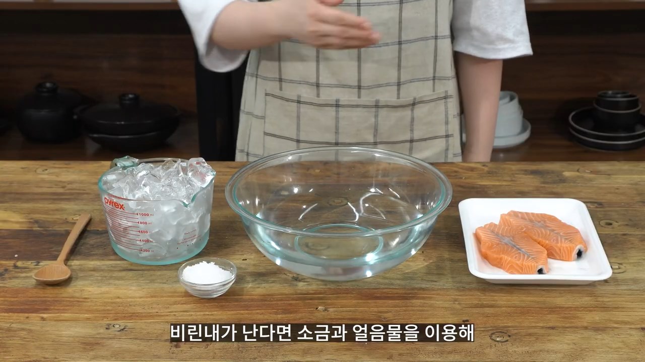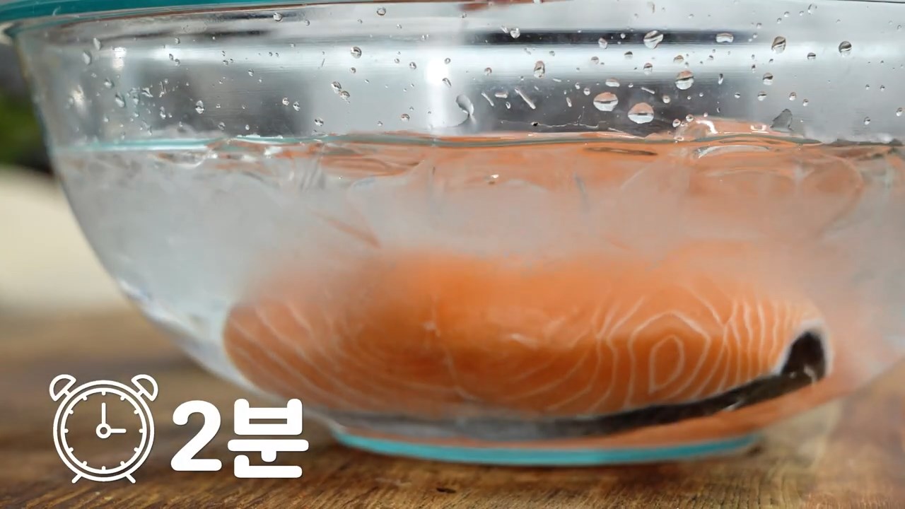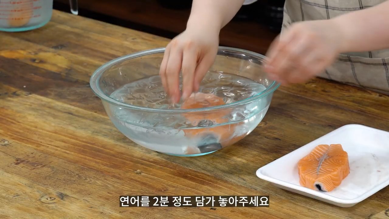소금을 푼 얼음물에 연어를 2분 정도 담가 놓아주세요. (물 1리터 기준, 소금 45g)
