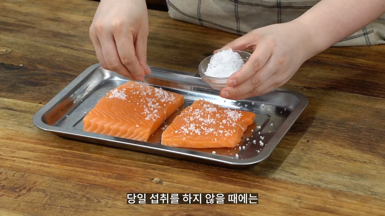 취향에 따라 연어를 소분한 후 소금을 앞뒤로 골고루 뿌려주세요.