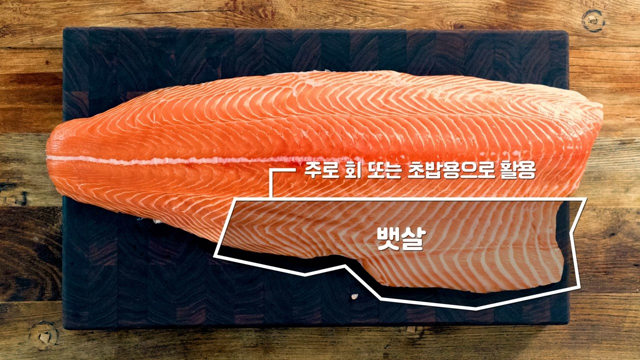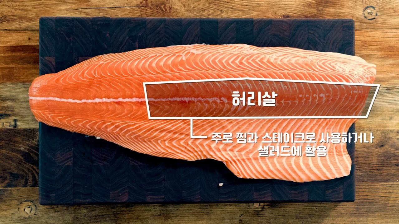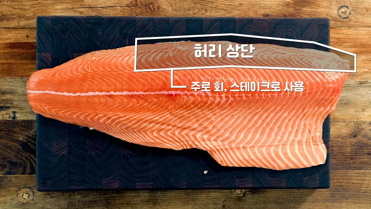 연어는 몸통을 기준으로 허리 상단, 허리살, 뱃살, 꼬리 부위까지 크게 4가지로 나누어집니다.