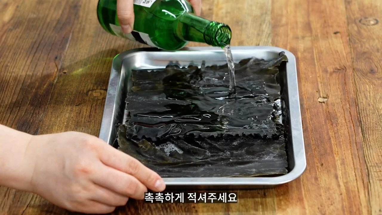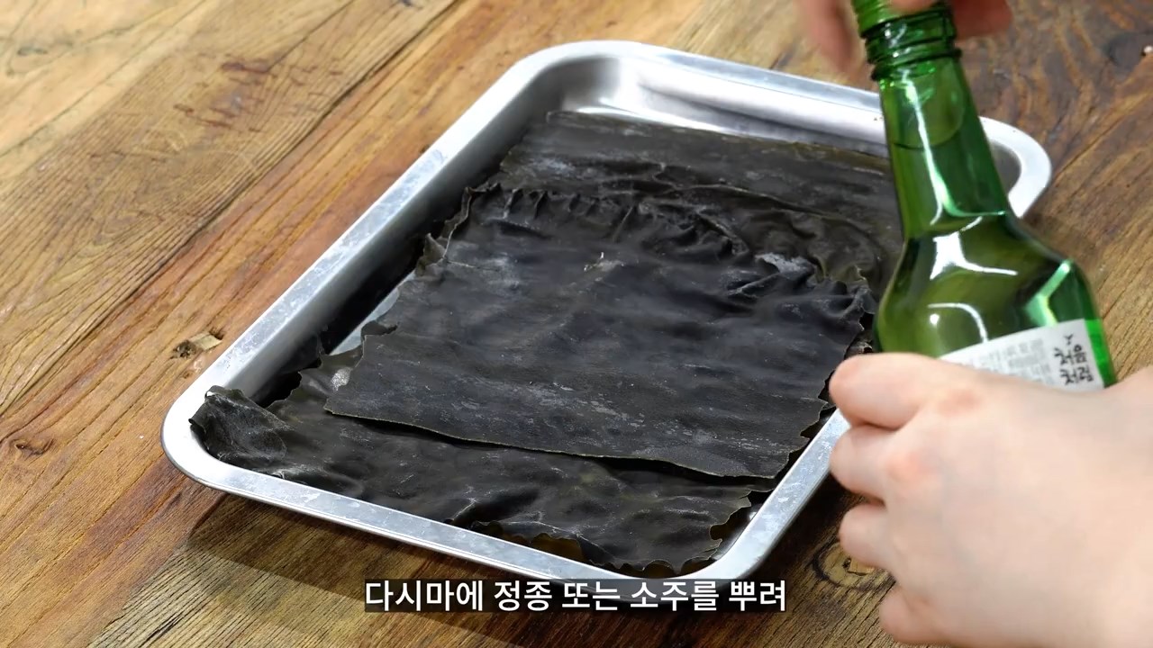 다시마에 정종 또는 소주를 뿌려 촉촉하게 적셔주세요.
